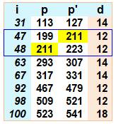 Tableau: i est le rang, p le nombre premier et d