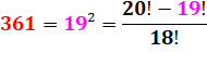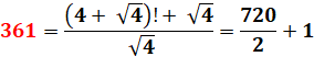361 = (6! + 2! ) / 2! = 1 + 3 x 4 x 5 x 6 |