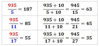 935 + 10 = 945 = 33 x 5 x 7 divisible par: 5 + 10 = 15 = 3 x 5 11 + 10 = 21 = 3 x 7 17 + 10 = 27 = 33