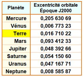 Très faible, mais cela suffit pour changer la quantité de chaleur reçue à la surface de la Terre, entre le PÉRIHÉLIE, position de la Terre le plus près du Soleil (4 janvier), et l'APHÉLIE où elle a son éloignement maximal (22 juin). Cette différence d'éloignement diminue le contraste des saisons dans l'hémisphère Nord et l'accentue dans l'hémisphère Sud. Dans 13 000 ans, ce sera le contraire. 0, 0549 pour la Lune Suite