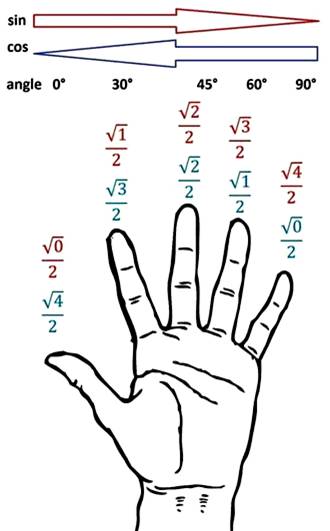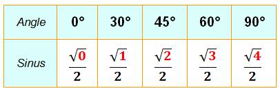 les valeurs du sinus des angles principaux. Pour le cosinus prendre l'angle complémentaire. |