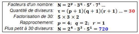 On se propose de trouver le plus petit nombre ayant trente diviseurs. Noter la formule qui donne cette quantité de diviseurs en fonction de
