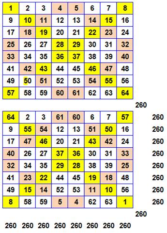 8 x 8 Les nombres de 1 à 64 (=8²) sont disposés dans la