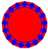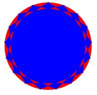 Un point sur k (quatre cercles du haut) Polygone régulier à 17côtés et Polygone formé en joignant un point sur k jusqu'à revenir au point