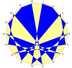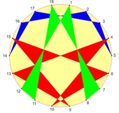 et 32 – 19 = 13. Le point qui succède 16 est le point 13. Au milieu k = 3. Essayez avec k supérieur. À droite, k = 8. Formation de trois polygones (colorés).