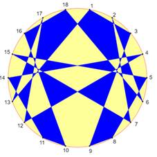 initial (pour fermer le polygone) Avec k = {3, 4, 5, 6} Modulo (trois cercles du bas) Polygone régulier de 18 côtés Les points sont joints selon le numéro du point multiplié par k et
