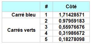 12 / 7 = 1,71428… Itérations Pour les carrés suivants (verts), la formule
