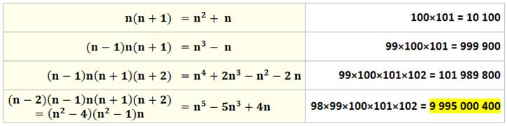 conformément à la formule indiquée ci-dessus. Ce calcul (98×99×100×101×102) est