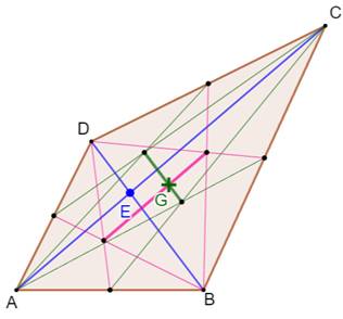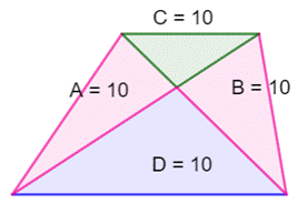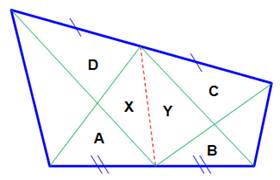 Construction Un quadrilatère et une médiane (pointillé rouge) Aires des triangles notées: A, B, C, D, X et Y. Quelle est l'aire de A connaissant B, C et D ? Piste La médiane d'un triangle le partage en deux