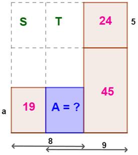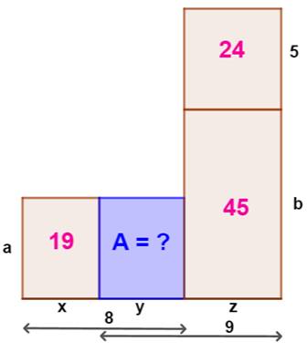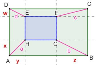 Problème Sur cette figure certains éléments sont connus. Retrouver l'aire du rectangle bleu. Solution Calcul des longueurs pas à pas: