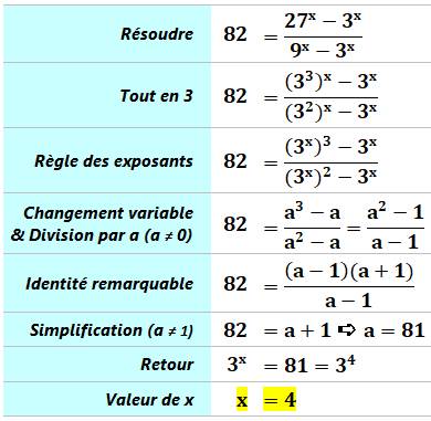 exposant. Piste Deux observations utiles: Les nombres 27 et 9 sont des puissances 3 Or, le nombre 82 est proche de 81, nombre qui est