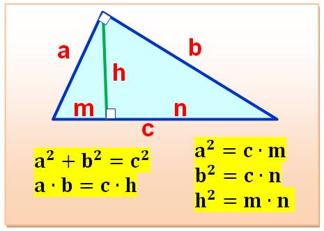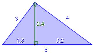 Exemple avec le triangle (3, 4, 5) 3² + 4² = 5² = 25 3 × 4 = 2,4 × 5 = 12 3² = 5 × 1,8 = 9 4² = 5 × 3,2 = 16 2,4² = 3,2 × 1,8 = 5,76 |