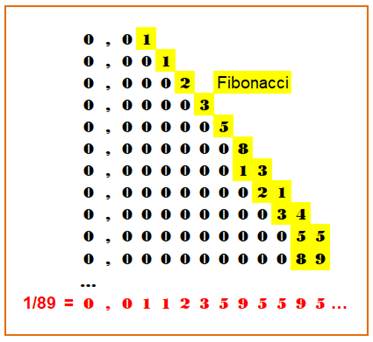 Fibonacci, peut engendrer une fraction (ici, 1/89) Les nombres de Fibonacci sont ajoutés en