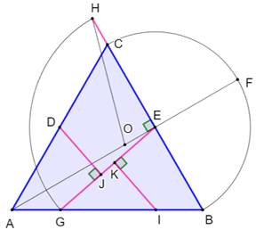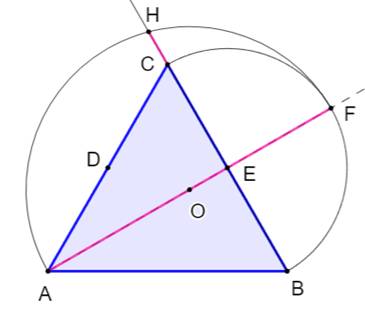 Étapes de construction Triangle équilatéral ABC. Milieux D et E des côtés AC et BC. Demi-droite AE. Demi-cercle BC. Intersection F. Milieu O de AF. Cercle (O, OA) Demi-droite BC. Intersection H. Cercle (E, EH). Intersection
