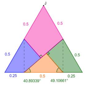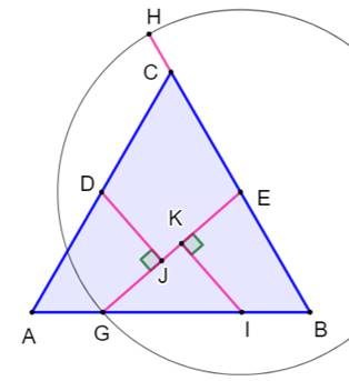 G. Segment GI = BE. Perpendiculaire de D à GE. Intersection J. Perpendiculaire de I à GE. Intersection K. Nous disposons de la dissection du triangle. Rappel: c = 2a = 2 × IK |