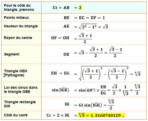 Avec un triangle équilatéral de côté 2, le côté du carré est égal à