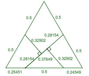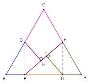 équilatéral Un triangle équilatéral ABC de côté unité. Les milieux D et E des côtés AC et BC. Perpendiculaires en D et E au côté AB. Intersection en F et G. Segment FE Perpendiculaires en D et G au segment FE. Le triangle est ainsi découpé en quatre