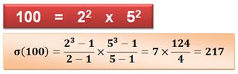 Div(100) = {1, 2, 4, 5, 10, 20, 25, 50, 100} Somme: 217 |
