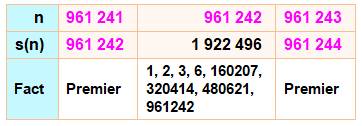 est deux fois somme de diviseurs pour 6 et 11. 3, 24, [14, 15, 23] 4, 96, [42, 62, 69, 77] 5, 72, [30, 46, 51, 55, 71] 6, 168, [60, 78, 92, 123,