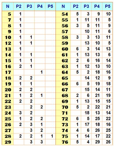 8, 2, 2 12, 2, 2, 2 13, 2, 3 17, 2, 2, 3 18, 3, 3 22, 2, 3, 3 27, 3, 3, 3 29, 2, 5 33, 2, 2, 5 34, 3, 5 38, 2, 3, 5 43, 3, 3, 5 50, 5, 5 53, 2, 7 54, 2, 5, 5 57, 2, 2, 7 58, 3, 7 59, 3, 5, 5 62, 2, 3, 7 67, 3, 3, 7 74, 5, 7 75, 5, 5, 5 78, 2, 5, 7 83, 3, 5, 7 98, 7, 7 99, 5, 5, 7 102, 2, 7, 7 107, 3, 7, 7 123, 5, 7, 7 125, 2, 11 129, 2, 2, 11 130, 3, 11 134, 2, 3, 11 139, 3, 3, 11 146, 5, 11 147, 7, 7, 7 150, 2, 5, 11 155, 3, 5, 11 170, 7, 11 171, 5, 5, 11 173, 2, 13 174, 2, 7, 11 177, 2, 2, 13 178, 3, 13 179, 3, 7, 11 182, 2, 3, 13 187, 3, 3, 13 194, 5, 13 195, 5, 7, 11 198, 2, 5, 13 203, 3, 5, 13 218, 7, 13 219, 5, 5, 13 219, 7, 7, 11 222, 2, 7, 13 227, 3, 7, 13 242, 11, 11 243, 5, 7, 13 246, 2, 11, 11 251, 3, 11, 11 267, 5, 11, 11 267, 7, 7, 13 290, 11, 13 291, 7, 11, 11 293, 2, 17 294, 2, 11, 13 297, 2, 2, 17 298, 3, 17 299, 3, 11, 13 302, 2, 3, 17 307, 3, 3, 17 314, 5, 17 315, 5, 11, 13 318, 2, 5, 17 323, 3, 5, 17 338, 7, 17 338, 13, 13 339, 5, 5, 17 339, 7, 11, 13 342, 2, 7, 17 342, 2, 13, 13 347, 3, 7, 17 347, 3, 13, 13 363, 5, 7, 17 363, 5, 13, 13 363, 11, 11, 11 365, 2, 19 369, 2, 2, 19 370, 3, 19 374, 2, 3, 19 379, 3, 3, 19 386, 5, 19 387, 7, 7, 17 387, 7, 13, 13 390, 2, 5, 19 395, 3, 5, 19 410, 7, 19 410, 11, 17 411, 5, 5, 19 411, 11, 11, 13 414, 2, 7, 19 414, 2, 11, 17 419, 3, 7, 19 419, 3, 11, 17 435, 5, 7, 19 435, 5, 11, 17 458, 13, 17 459, 7, 7, 19 459, 7, 11, 17 |