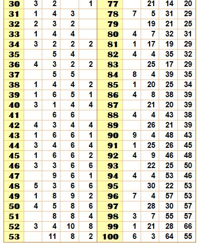 donné pour tous les cas jusqu'à 100. Voir exemple avec 28 dont toutes les partitions