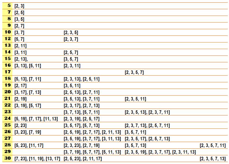 61], [2, 5, 61], [3, 5, 7, 53], [2, 3, 5, 11, 47] 69, [2, 67],