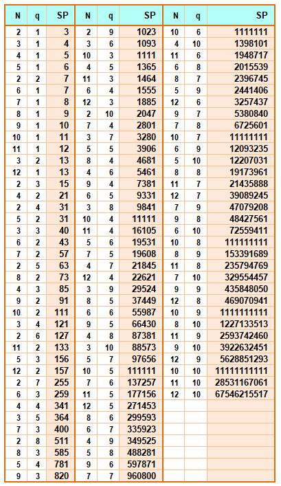 n q SP 2 2 5 3 2 9 2 3 14 4 2 17 2 4 30 5 2 33 3 3 36 2 5 55 6 2 65 2 6 91 4 3 98 3 4 100 7 2 129 2 7 140 2 8 204 3 5 225 8 2 257 5 3 276 2 9 285 4 4 354 2 10 385 3 6 441 2 11 506 9 2 513 2 12 650 3 7 784 6 3 794 4 5 979 10 2 1025 3 8 1296 5 4 1300 3 9 2025 11 2 2049 4 6 2275 7 3 2316 3 10 3025 12 2 4097 3 11 4356 5 5 4425 4 7 4676 6 4 4890 3 12 6084 8 3 6818 4 8 8772 5 6 12201 4 9 15333 7 4 18700 9 3 20196 6 5 20515 4 10 25333 5 7 29008 4 11 39974 10 3 60074 4 12 60710 5 8 61776 6 6 67171 8 4 72354 7 5 96825 5 9 120825 11 3 179196 6 7 184820 5 10 220825 9 4 282340 7 6 376761 5 11 381876 6 8 446964 8 5 462979 12 3 535538 5 12 630708 6 9 978405 |