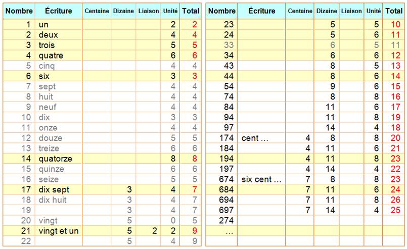 qui s'écrivent avec k lettres (compte fait sans trait d'union ni espace) Exemple: les nombres 6 et 10 s'écrivent avec