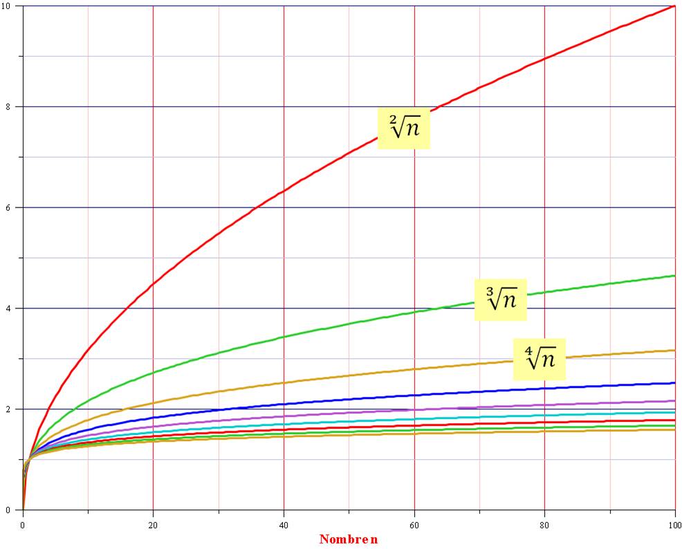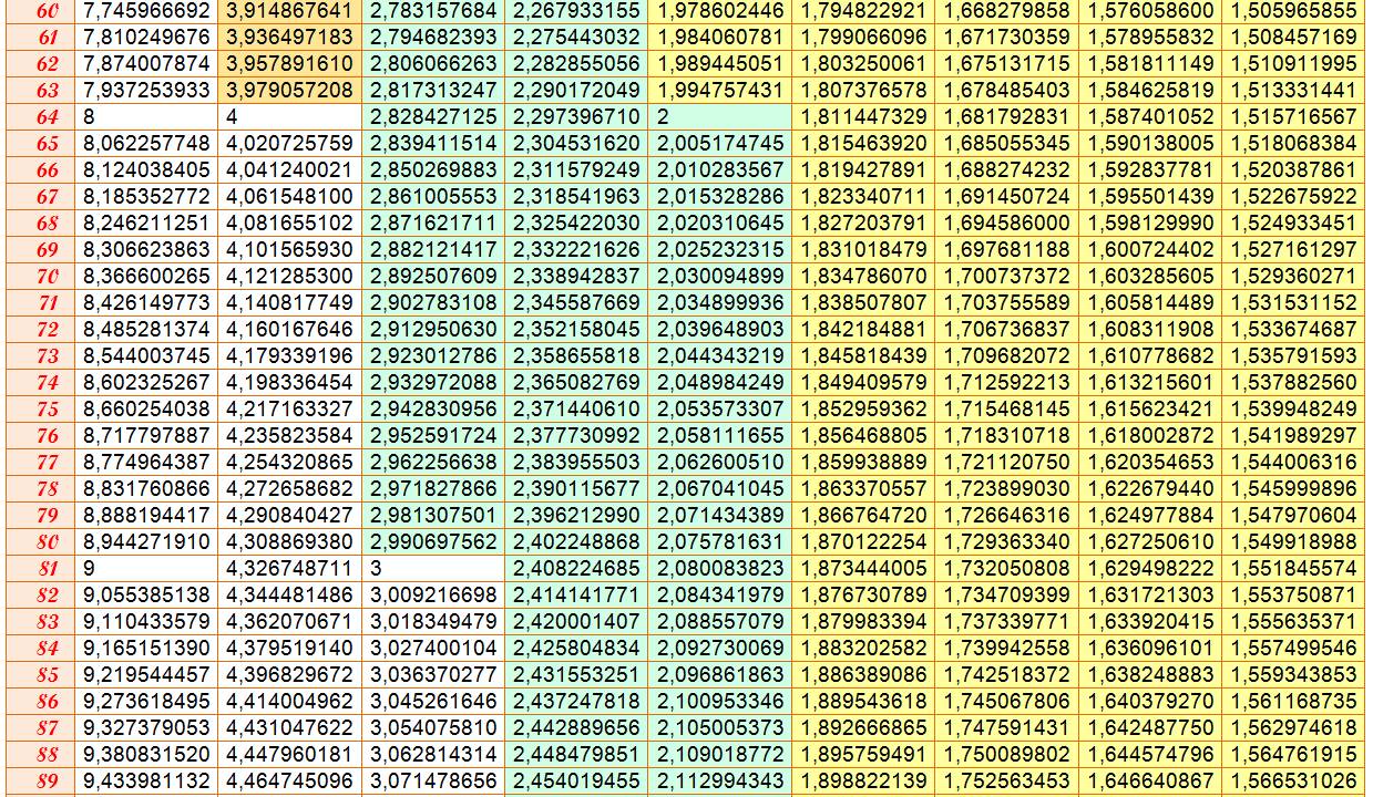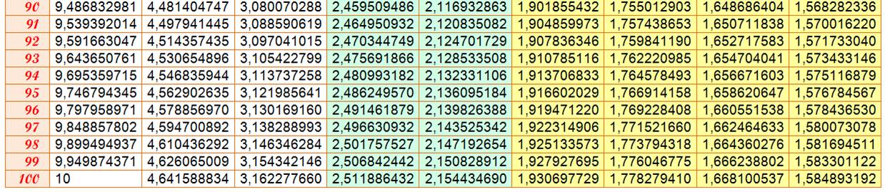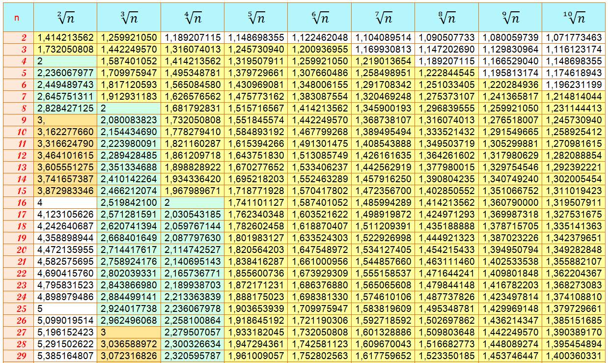 Racine carrée, cube, jusqu'à 10 Des nombres de 2 à 100. |