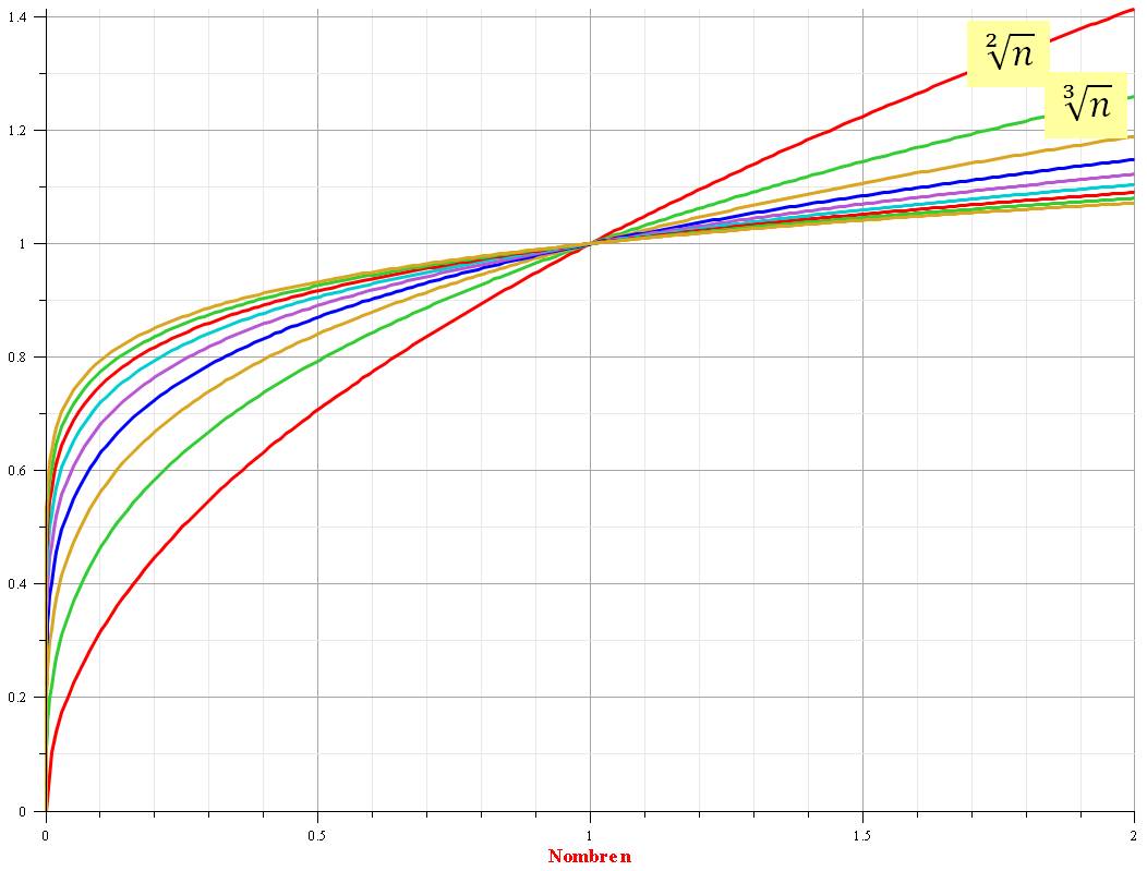Racine carrée, cube, jusqu'à 10 Des nombres de 0 à 100. Avec zoom autour de 0 à 2. |