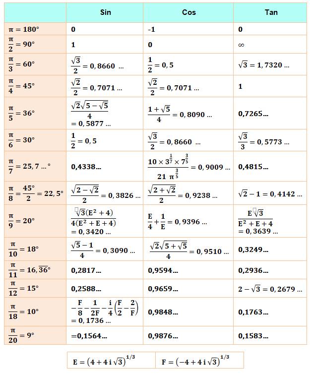 que l'on retrouve dans les polygones. Notes Chaque constante trigonométrique indiquée est accompagnée de sa valeur