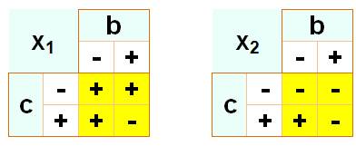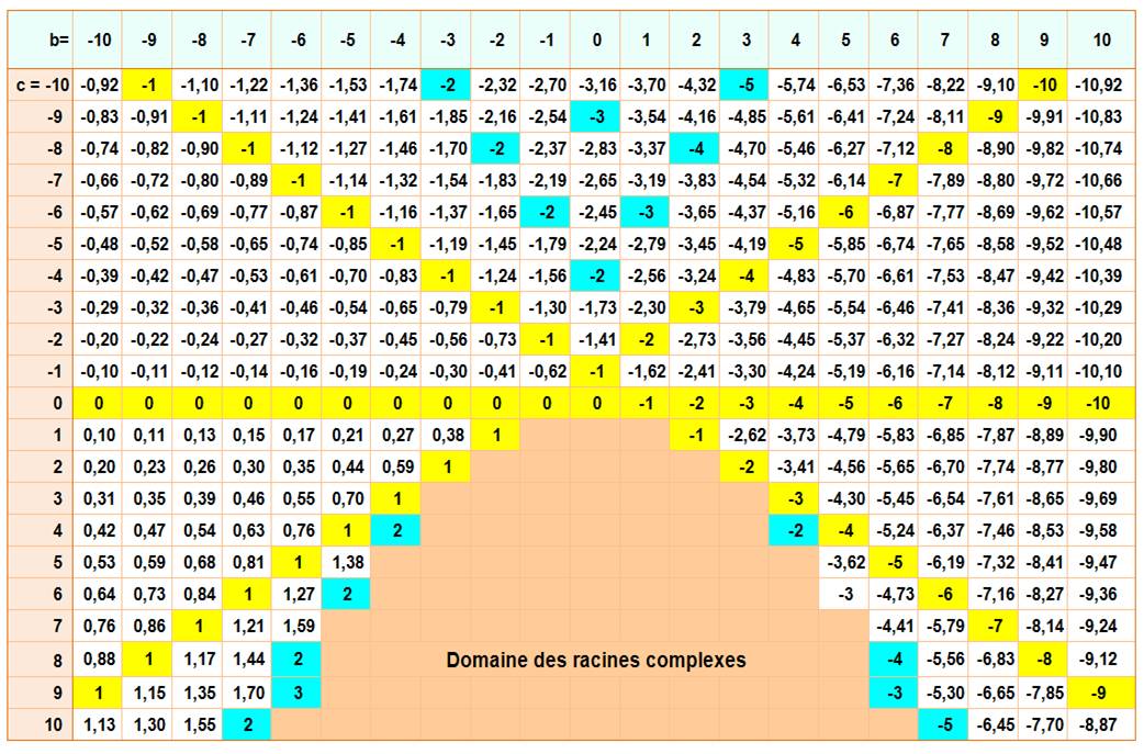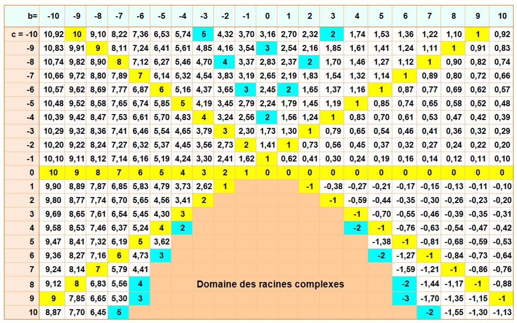 les solutions pour les coefficients entiers b et c de -10 à +10 de l'équation