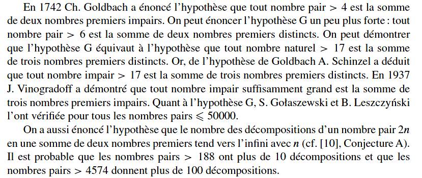 Sommaire de cette page >>> Conjectures forte et faible >>> Conjecture de la mi-distance >>> Historique >>> Vision résumée en 2014 >>> Témoignages de Schinzel et Sierpinski >>> Évaluation de la quantité de partitions >>> Goldbach et totient d'Euler >>> Bilan |