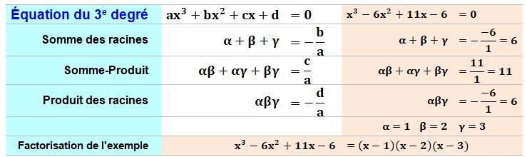 et les coefficients du polynôme. Relations prouvées par Viète en 1579. Illustration: exemple avec le troisième degré |