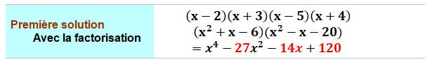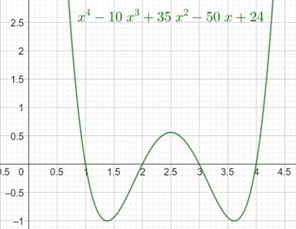 les racines, pas si évident de trouver les quatre racines. Ici, on peut deviner que 24 = 4! = 1 × 2 × 3 × 4 et tester les autres relations |