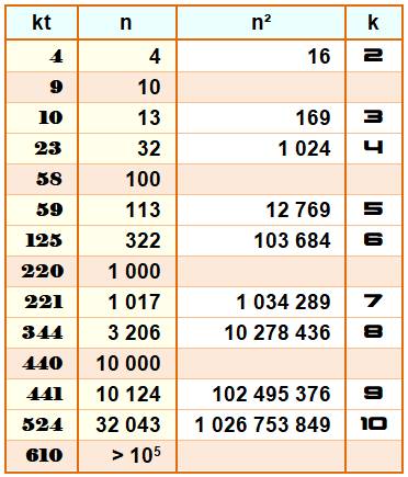 Plus petits nombres carrés Colonne de gauche: kt quantité de tels