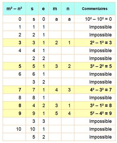 possible! N = n² – m² Valeurs de n et m