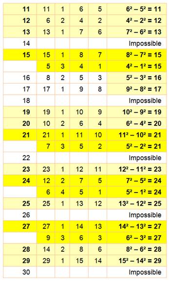De 0 à 10 toutes les possibilités s.e En jaune pale les nombres différences de carrés,