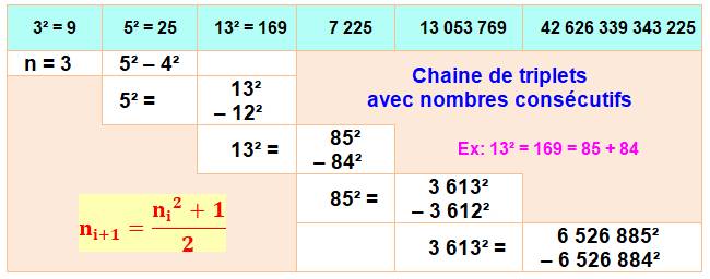 113² – 112² = 15² Même liste mais avec les carrés [3, 25, 169, 7225, 13053769,