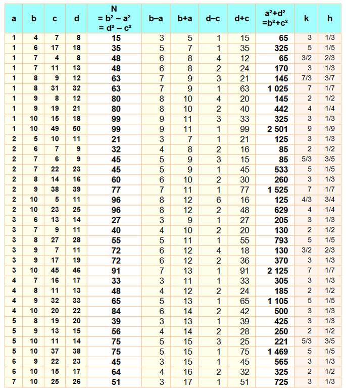 M = 1² + 18² = 6² + 17² = 10² + 15² N = 18² – 17² = 6² – 1² = 35 N' = 18² – 15² = 10² – 1² = 99 N" = 17² – 15² = 10² – 6² = 64 |