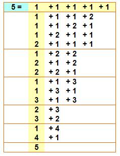 P(5) = 7 Les nombres sommants sont rangés par ordre