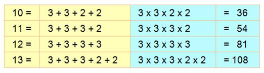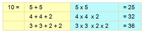 5 => 25; 10 = 3 + 2 + 5 => 30; le 5 remplacé par 3 + 2 est plus