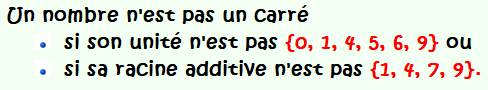 carré. Si l'unité est {5} et la dizaine est paire, ne n'est pas un carré. Sinon, en ayant retiré les éventuels zéros finaux, N devient N' Si la racine numérique additive de N' n'est pas {1, 4, 7, 9}, ce n'est