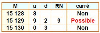 fait de son unité. 15 130 n'est pas un carré du fait de sa dizaine. 15 129 passe les trois tests et alors, ce nombre est susceptible