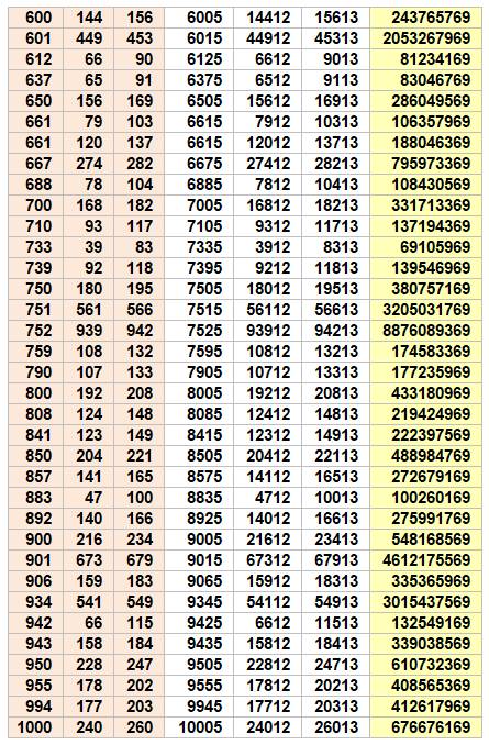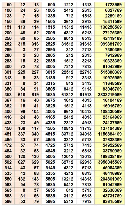 Liste [54, 72, 90, 6], [192, 756, 780, 12], [200, 375, 425, 10], [270, 704, 754, 12], [343, 1176, 1225, 14], [432, 576, 720, 12], [1458, 1944, 2430, 18], [1536, 6048, 6240, 24], [1600, 3000, 3400, 20], [1750, 2880, 3370, 20], [2160, 5632, 6032, 24], [2744, 9408, 9800, 28], [3456, 4608, 5760, 24], [5145, 7616, 9191, 28], [6750, 9000, 11250, 30], [7000, 8775, 11225, 30], [7560, 8250, 11190, 30], … |