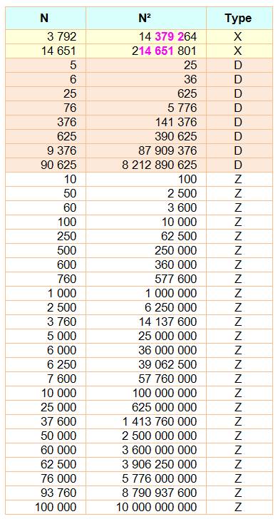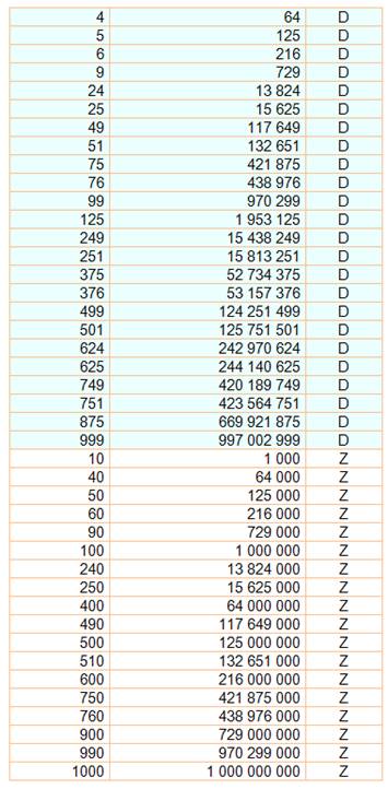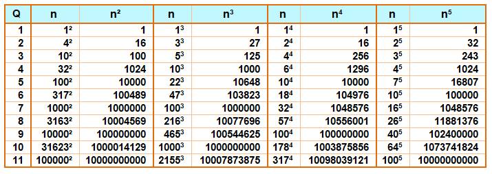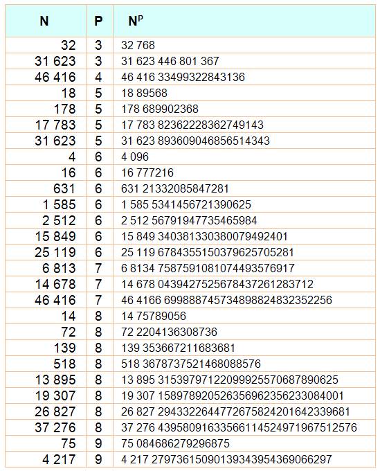 Liste ordonnée des nombres de cette table 1, 16, 27, 32, 100, 125, 243, 256, 1000, 1024, 1296, 10000, 10648, 16807, 100000, 100489, 103823, 104976, 1000000, 1048576, 10004569, 10077696, 10556001, 11881376, 100000000, 100544625, 102400000, 1000000000, 1000014129, 1003875856, 1073741824, 10000000000, 10007873875, 10098039121. |