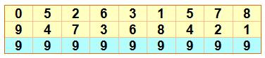 chiffre d'une moitié ajouté à son homologue de l'autre moitié donne 9: 1+8 = 9, 4+5 = 9 et 2+7 = 9. |