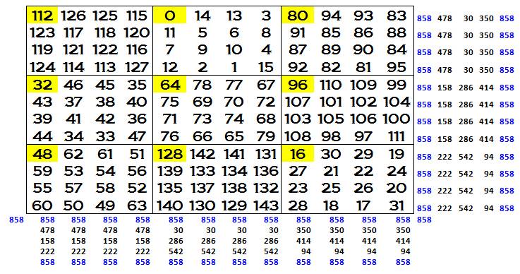 des multiples de 16 (jaune). On a pris le carré 4x4 avec les nombres de 0 à 15