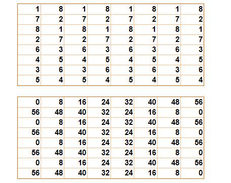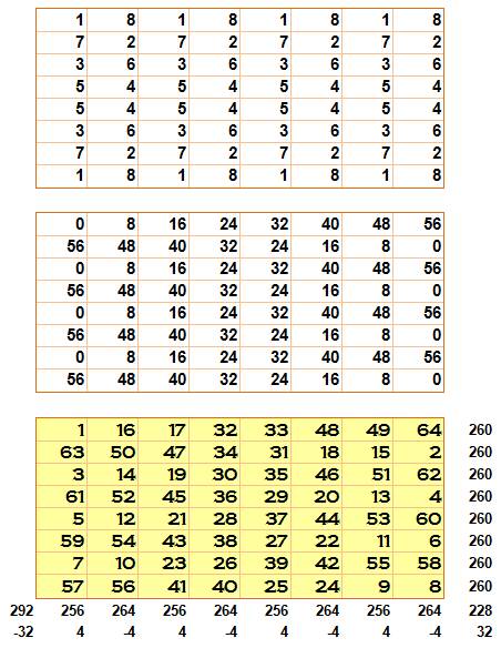 deuxième carré est rempli avec nombres (0, 8, 16, 24, 32, 40, 48, 52).