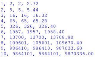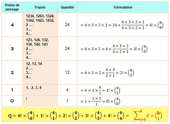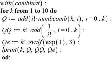 Commentaires Appel aux logiciels de combinatoire. Lancement de la boucle d'analyse des valeurs de k de 1 à 10. Calcul de Q, la somme (add) de i factorielle